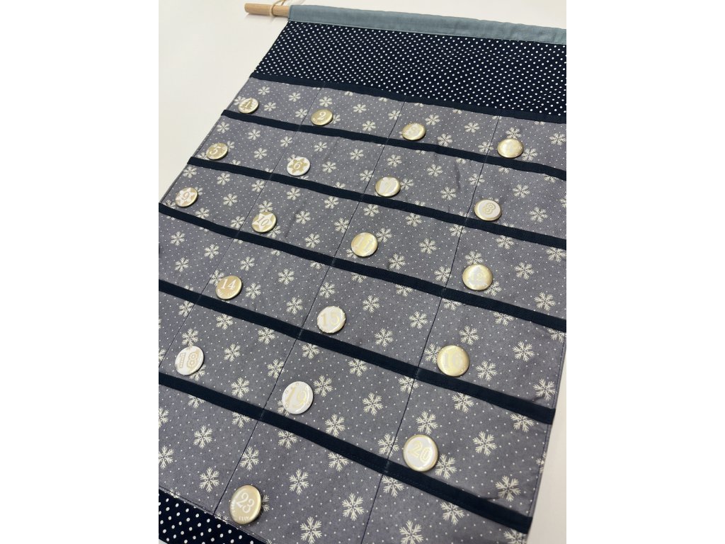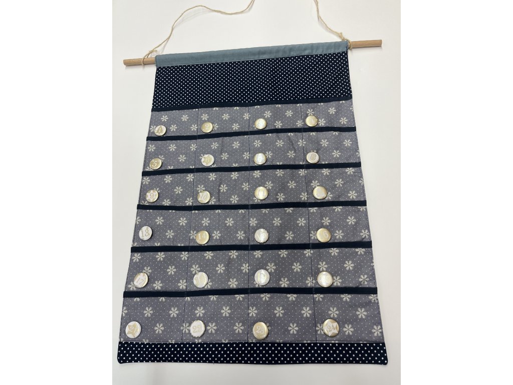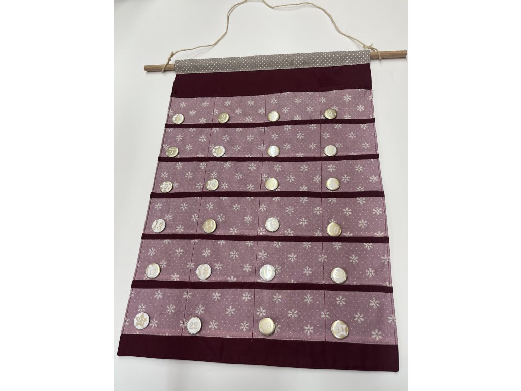 Součástí balení je látkový adventní kalendář, čísla, tyčka a provázek na zavěšení.