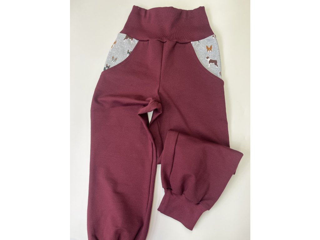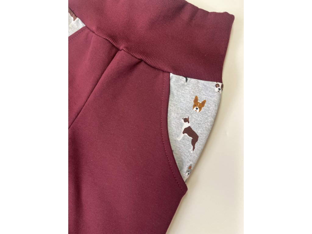 Bordó tepláky s buldočky. Mají pružný pas.